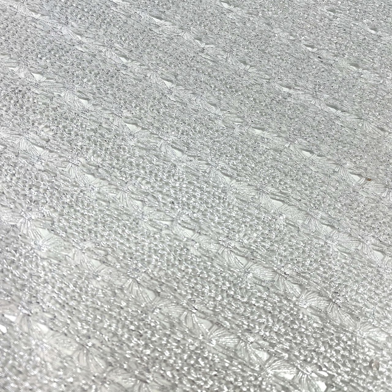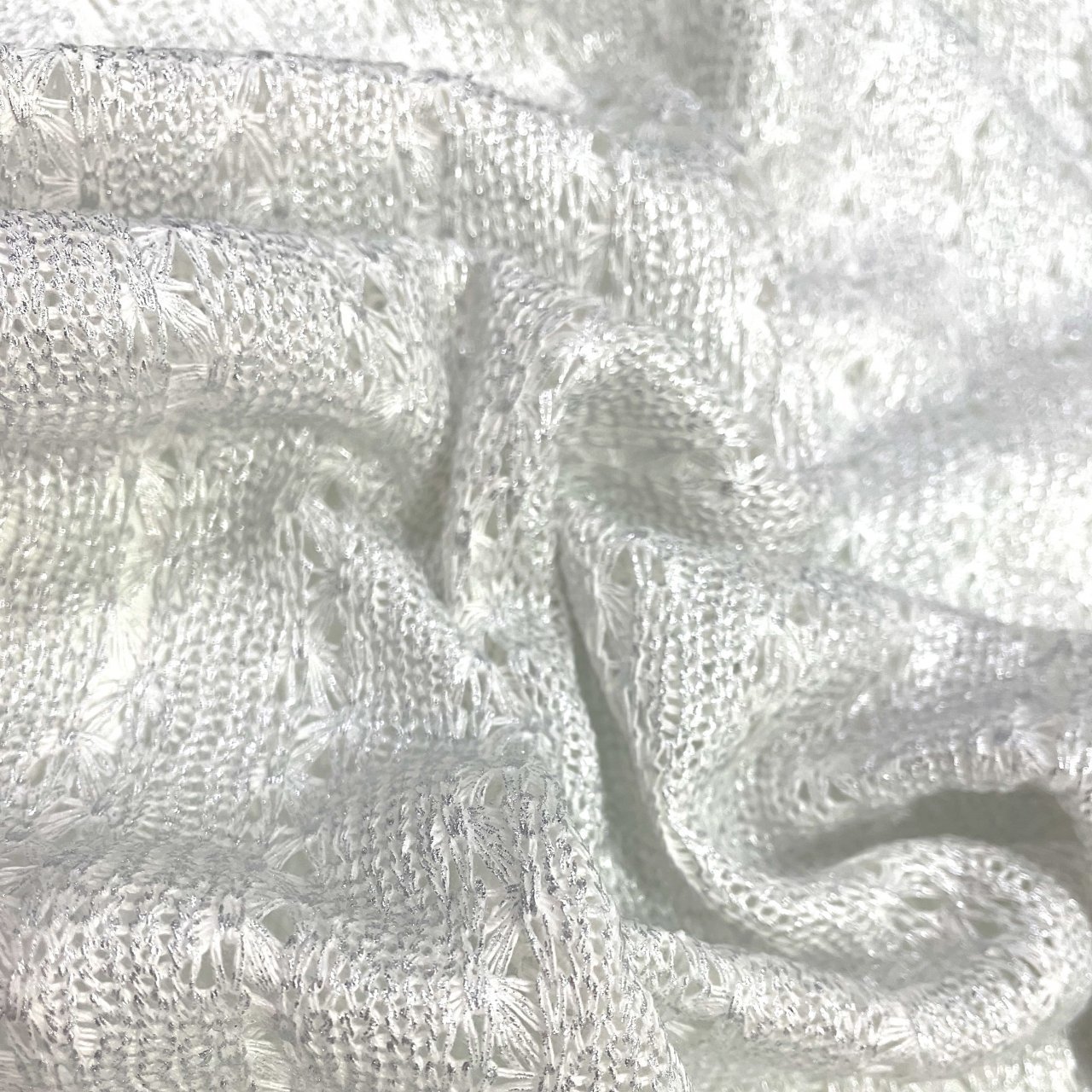 Прекрасный тонкий изящный трикотаж, напоминающий плетеное кружево. Проявите фантазию и дополните свой гардероб коллекцией из элегантных платьев, женских халатов и пижам, многообразия вечерних нарядов, а также оригинальных топов и сарафанов. Подчеркните свою индивидуальность. Требует деликатного обращения - ручная стирка , сушка в горизонтальном положении. Очень деликатная утюжка. Поверх вязки нанесено напыление серебром
